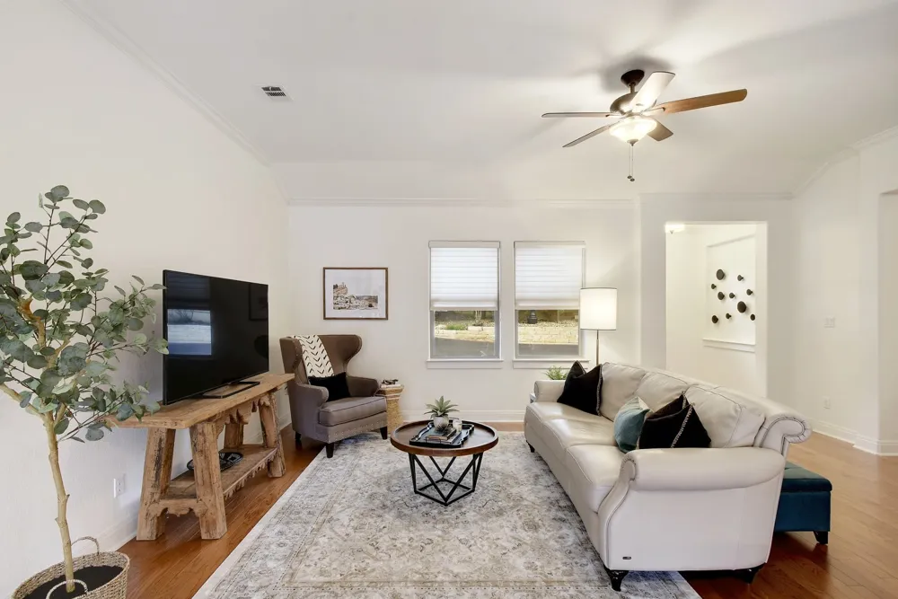 Craftsman-style one-story home in desirable Spillman Ridge offering an easy lock-and-leave lifestyle in the heart of 78738. This bright, open-concept floor plan lives larger than a typical two-bedroom, with a spacious living, kitchen, and dining area filled with natural light—perfect for everyday living and entertaining. Hardwood floors, neutral tones, and a seamless layout create an inviting feel throughout. Both bedrooms are generously sized. The secondary bedroom easily accommodates two full beds with room for additional furniture or a desk. The primary suite features double vanities, a separate shower, and a walk-in closet. Set on a greenbelt lot with lawn maintenance included by the HOA. Community pool and pavilion. Zoned to exemplary Lake Travis ISD. Minutes to Hill Country Galleria, Whole Foods, golf, medical facilities, and dining. Backyard fence to be enlarged in May. Offered fully furnished if desired. Owner/Agent.