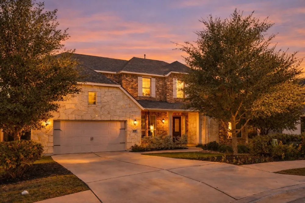 Located in the highly sought-after Travisso community in Leander, this north-facing luxury home offers real hardwood floors, extensive upgrades, and private greenbelt views. Set on a quiet partial cul-de-sac, the home is within walking distance to the new Travisso amenity center, community pond, and hike-and-bike trails. The open-concept Palisade floor plan features a dedicated home office, a main-level guest suite with a private bath, and a spacious living room with a floor-to-ceiling stone gas fireplace and a wall of windows overlooking the greenbelt. The chef’s kitchen includes quartz countertops, a wrapped island, soft-close cabinetry, a stainless-steel farmhouse sink, Café appliances, spice rack, wine rack, under-cabinet lighting, and a double trash pull-out. Upgrades throughout the main level include genuine hardwood flooring and premium finishes rarely found in newer construction nearby. The private primary suite includes bay windows, a tray ceiling, and peaceful greenbelt views. The spa-inspired bath offers a freestanding tub, frameless walk-in shower with dual shower heads, granite counters, and a barn door entry. Upstairs are a media room pre-wired for surround sound, a game room, and three secondary bedrooms with access to en-suite or nearby baths. The south-facing covered patio features tile flooring, a built-in outdoor kitchen with gas grill and mini-fridge, LED lighting, a TV mount, and an industrial fan. A freshly stained deck expands the outdoor living area and overlooks the greenbelt. Additional features include a 3-car tandem garage with EV charger, epoxy flooring, attic storage, blown-in insulation, utility sink in the laundry room, and pre-plumbing for a pool. Travisso residents enjoy resort-style amenities including a clubhouse, fitness center, pools, tennis courts, playgrounds, and year-round events. Convenient access to Leander ISD schools, shopping and dining in Cedar Park, and commuter routes via 1431 and 183A.