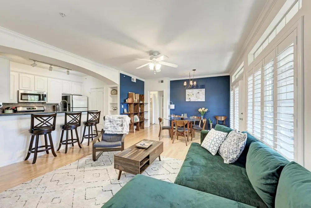 Welcome home to easy, modern living in this well-appointed condo located near the Arboretum, Gateway area, and The Domain. The open layout connects the living, dining, and kitchen spaces, creating a comfortable flow that works just as well for everyday living as it does for hosting friends. Hardwood and tile flooring runs throughout, and the kitchen offers granite countertops, a farmhouse sink, stainless-steel appliances, and a breakfast bar that’s perfect for morning coffee or casual meals. Step out onto your private balcony—accessible from both the living area and the secondary bedroom—and enjoy peaceful treetop views, a great spot to relax after a long day. The condo offers plenty of storage to keep things organized and out of sight. This gated community features a pool, spa, gazebo, and outdoor grill area, giving you plenty of options to enjoy the outdoors without leaving home. A private garage and convenient guest parking add to the ease of living here. Recent updates include plantation shutters, patio flooring, a Nest thermostat, a Yale smart front door lock, and a fire sprinkler system, Hunter ceiling fans in bedrooms and living area, updated light fixture in dining area. Furniture and furnishings may be available for purchase. Washer and dryer included. Information provided is deemed reliable but not guaranteed. Buyer and buyer’s agent to independently verify all information.