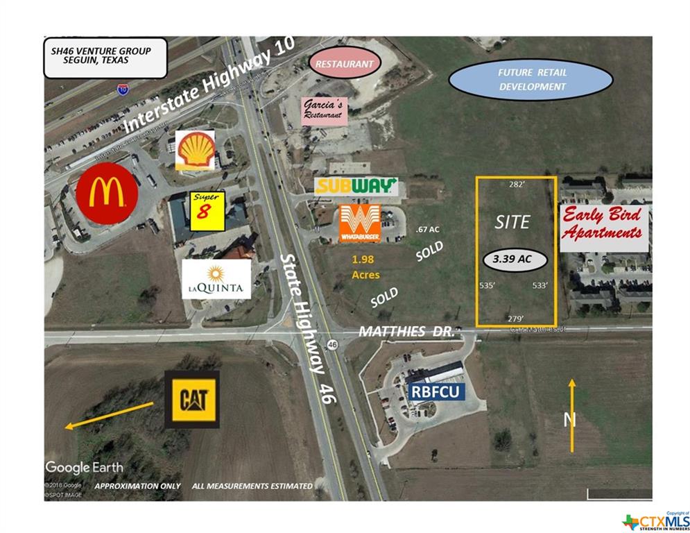 Commercial, office, retail, fronting CH Matthies near SH 46. Easy access to IH-10. Area businesses include Whataburger, LaQuinta, Randolph Brooks FCU, Subway, McDonalds, Burger King. Excellent traffic and visibility.